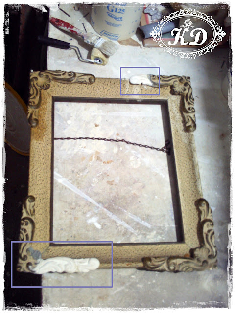 ¿Recuerdan cuando les conté que tenía en mi garage dos cajones repletos de estos marcos esperando renovación? Bien, a un par de ellos les tocó el turno esta semana... Son los clásicos que solíamos ver en las casas de nuestras abuelas conteniendo las fotos familiares, de madera con molduras de yeso que por lo general se doraban a la hoja para darles mayor realce. A estos dos, idénticos, de buen tamaño y con una textura bastante original, los conseguí en una feria vecinal hace años -por cierto, venían con los retratos de unos graciosos niñitos, los cuales guardé "por si acaso" ya que tienen ese encanto vintage que está tan de moda hoy en día-; y desde el momento mismo en que llegaron a mis manos visualicé exactamente lo que quería hacer con ellos. El único problema era que a uno le faltaban trozos de las molduras en las esquinas...